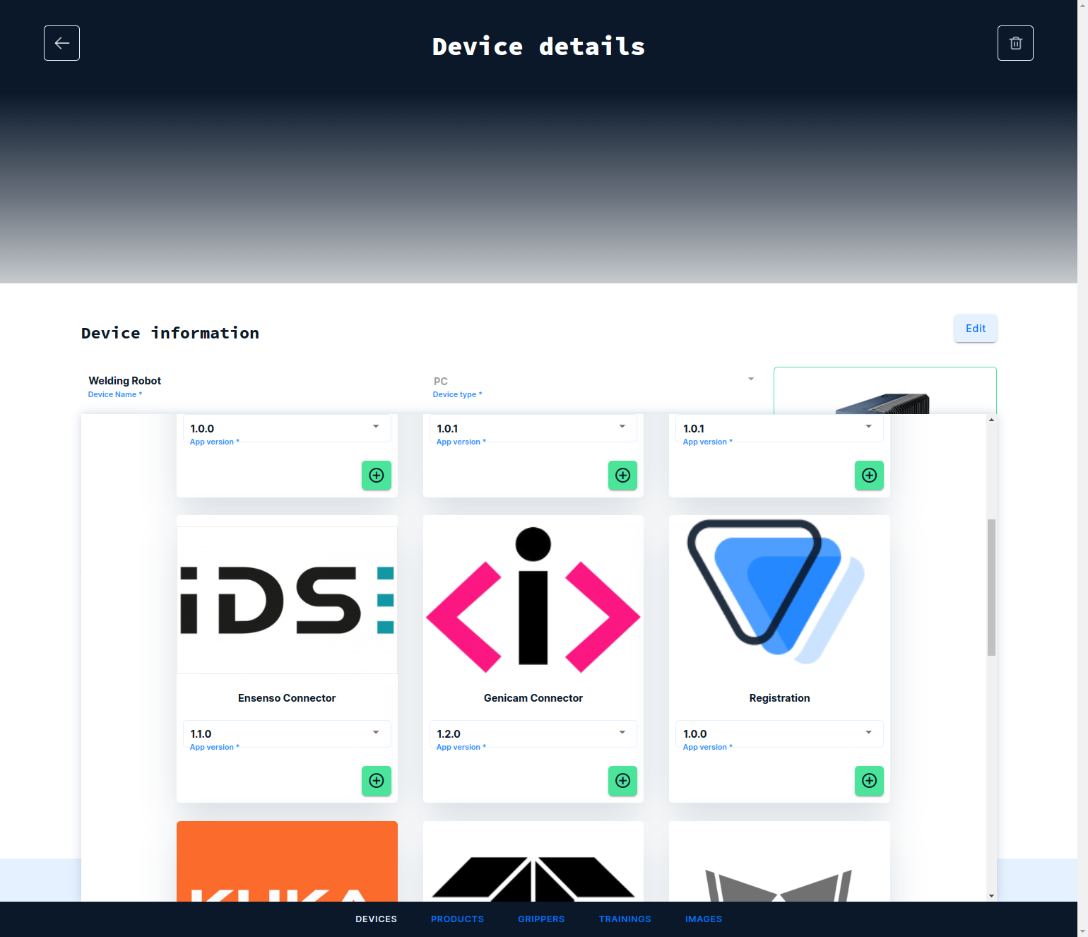 Navigate to the Devices tab and open the device to which the camera is connected. Under Apps click on the card with the title Add Apps: