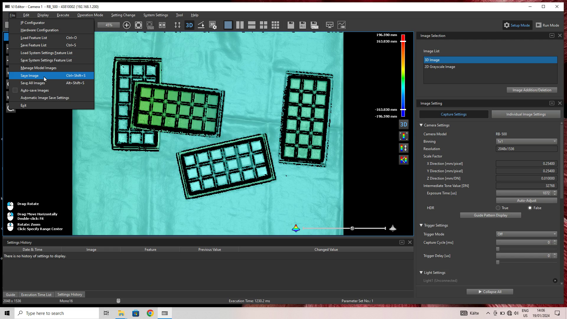 Download and install the required SDK from the VJ support site. Make sure your camera is accessible through the local network from the PC used for image capture. Start the VJ Editor and record images by clicking on the play icon in the top-left area of the screen: