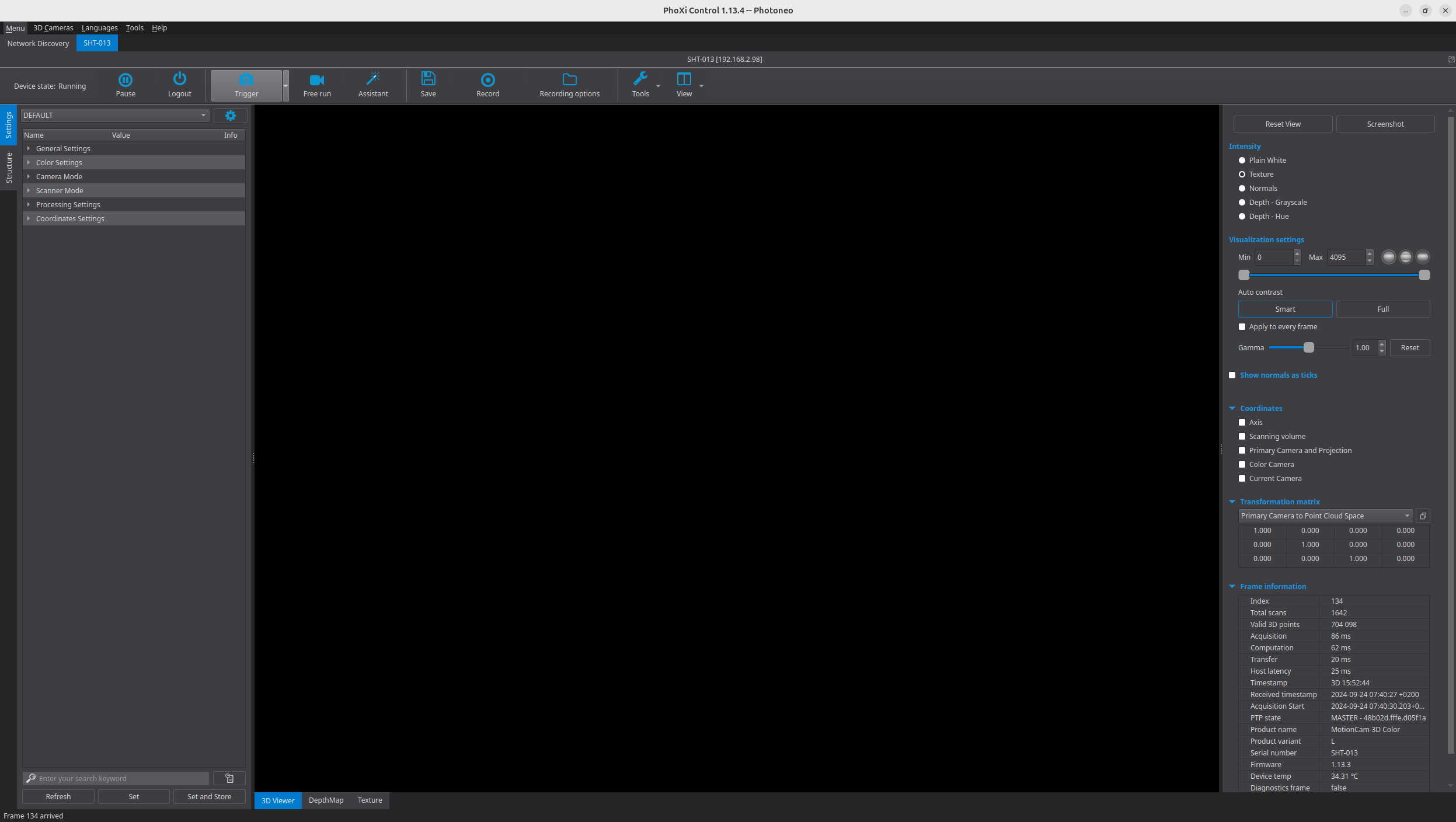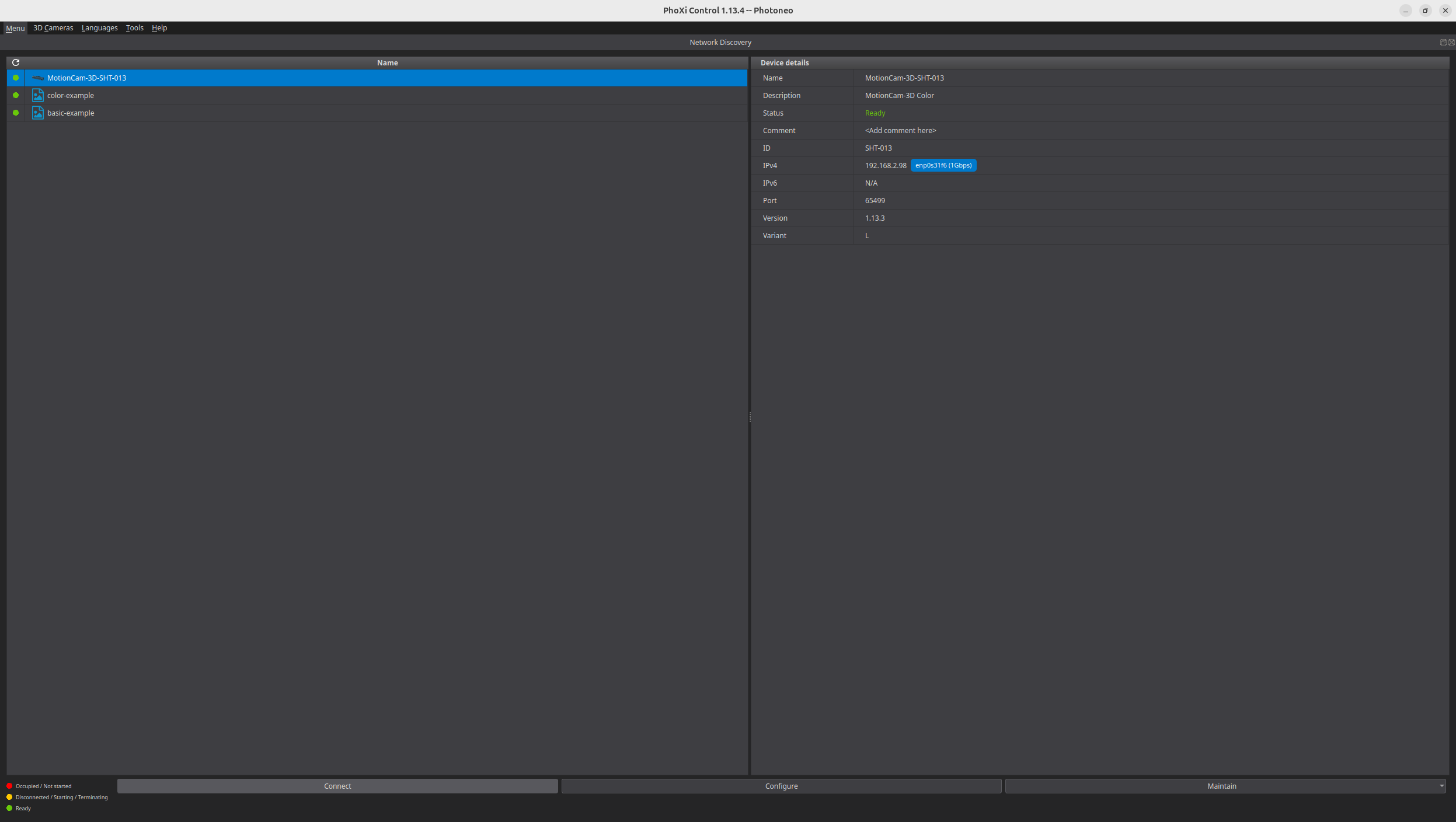 Download and install PhoXi Control. Make sure your camera is accessible through the local network from the PC used for image capture, then select it in the list appearing on the left side of the window, and click Connect at the bottom: