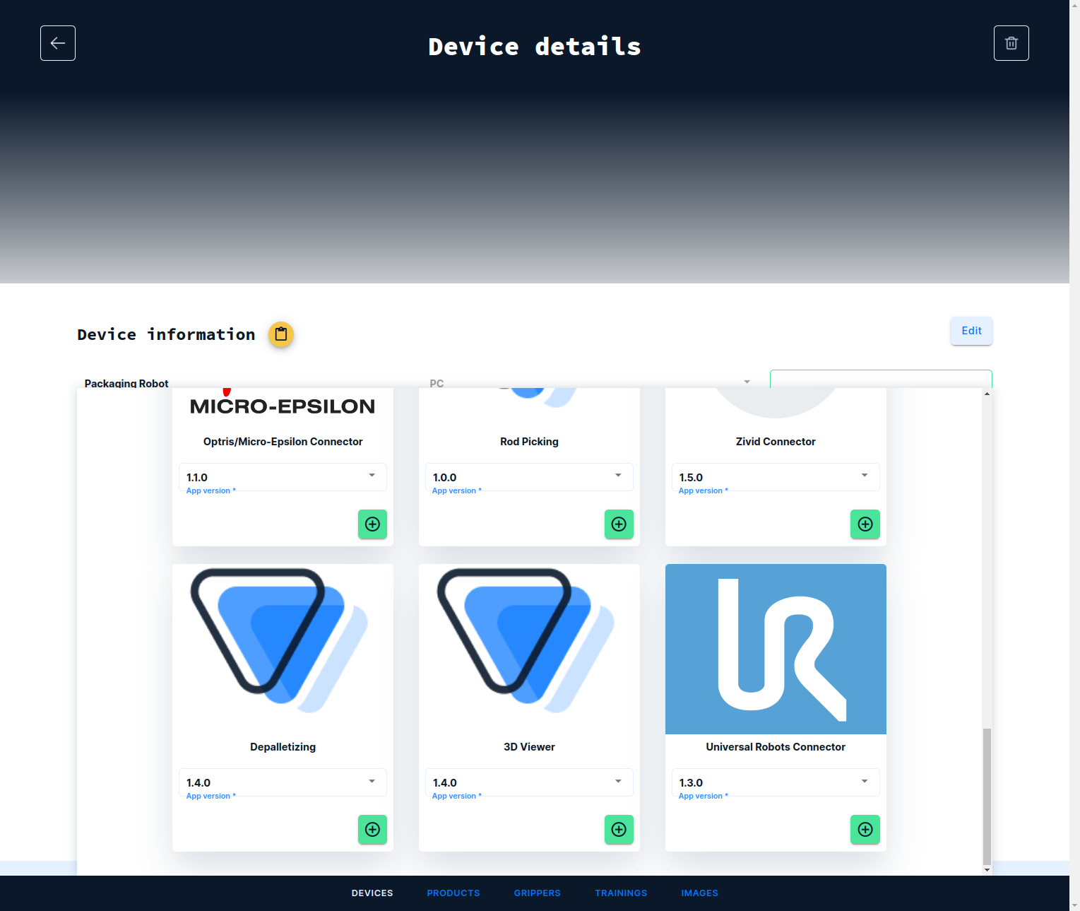 Log into the frontend at https://www.vathos.vision, navigate to the device page, and make sure the UR Connector app is installed on the device designated for communication with this robot: