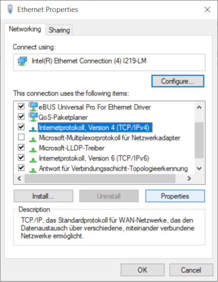 In the list of connection properties in the middle of the dialog, select Internet Protocol, version 4 (TCP/IPv4) and hit Properties: