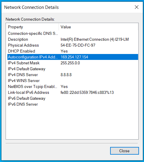 Now connect your PC with one of the NICs on the edge device. A so-called local link between your PC and the edge device has been established if your adapter has been assigned an IP in the range 169.254.0.0 through 169.254.255.255, which you can verify by clicking on Details on the main adapter page shown above: